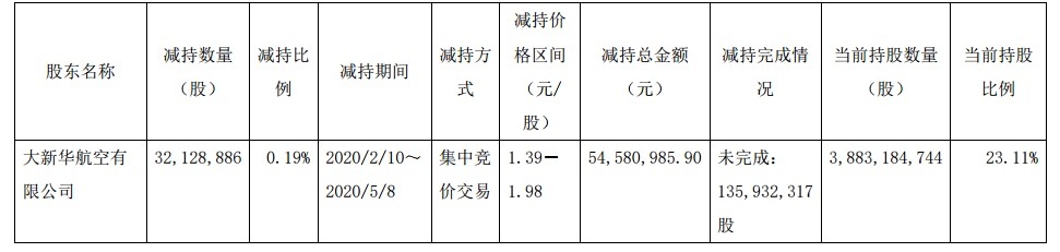 公告顯示,截至2020年5月8日,海南航空控股股份有限公司(以下簡稱“海航控股”或“公司”)控股股東大新華航空有限公司(以下簡稱“大新華航空”)直接持有公司股份3,883,184,744股,占公司總股本的23.11%。
